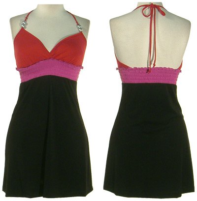 Stretch jersey knit tri-color dress has halter spaghetti straps accented with large silver tone beads. The triangle style bust has a crossover neckline and is lightly padded for shape. The empire waist is shirred with a contrast panel and finished with ruffle trim. The short a-line skirt drops down with a folded bottom hem.