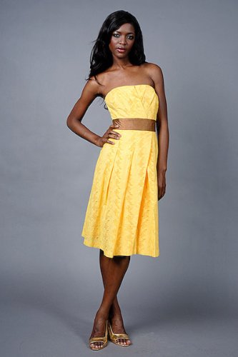 This flat out gorgeous yellow strapless dress has a square neckline, a brown banded empire waist and a flared long skirt.