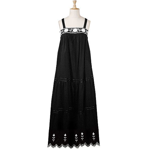 A very feminine dress with plenty of finishing touches to soft cotton: floral motifs embroidered banding on top, satin ribbon trim tiered panels, shirring at embroidered band, slim straps with satin ribbon trim and scalloped hemline with leaf embroidered motifs. Hidden side zip closure. Regular: 54" length. Cotton; machine wash. 100% COTTON
