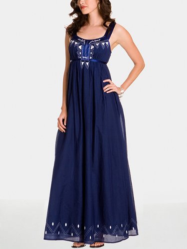 Bohemian style is a must this summer. Adjustable silk spaghetti strap. Empire waist. Geometric and silk detail on front. Ankle length. Zip back. 70% cotton, 30% silk Hand wash.